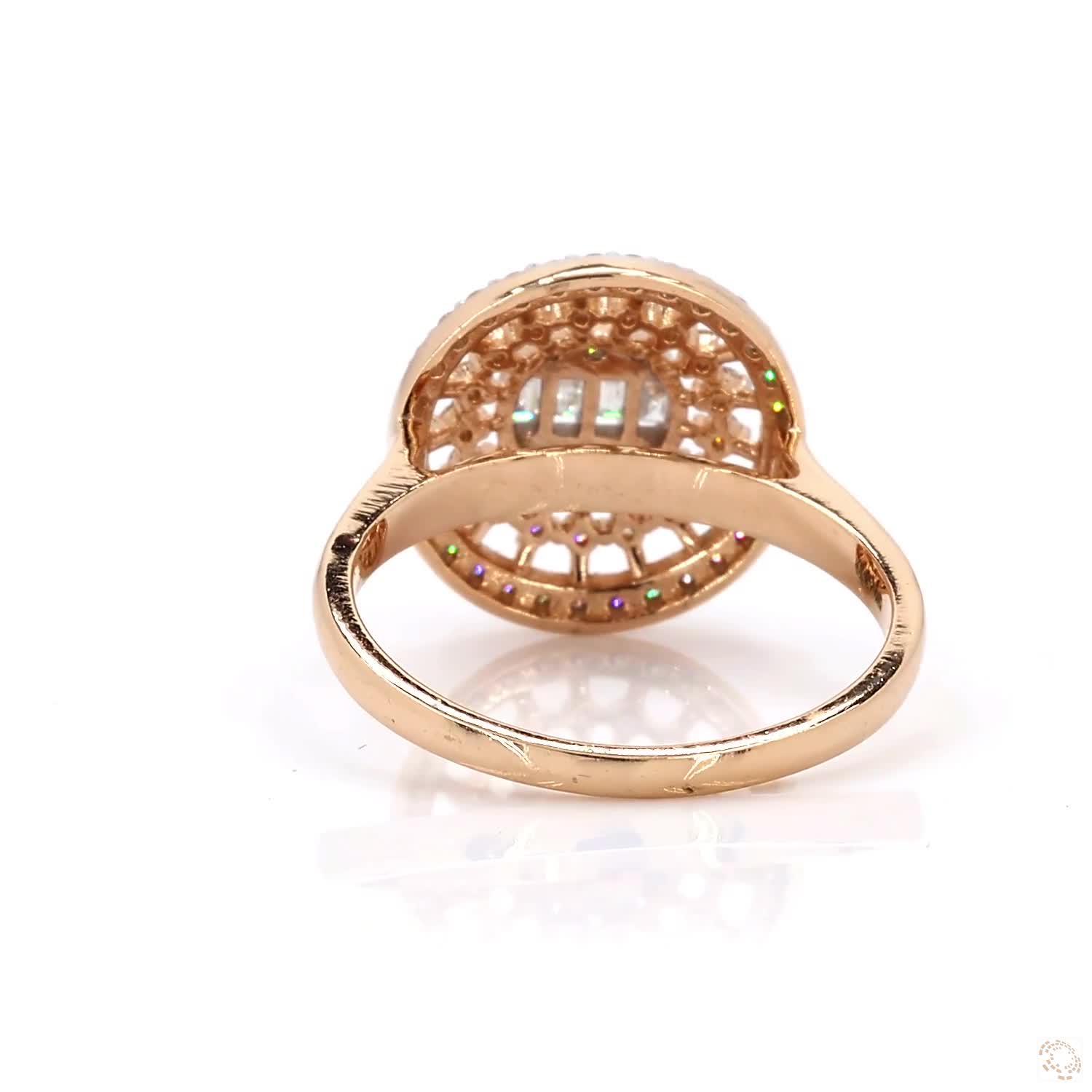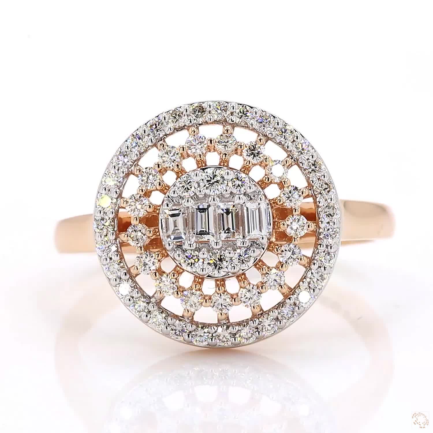 The round diamonds, reminiscent of twinkling stars, are artfully arranged to create a sense of movement and light, while the baguette diamonds add a contemporary edge and structured elegance. The interplay of shapes creates a mesmerizing visual effect, making the ring a true statement piece.