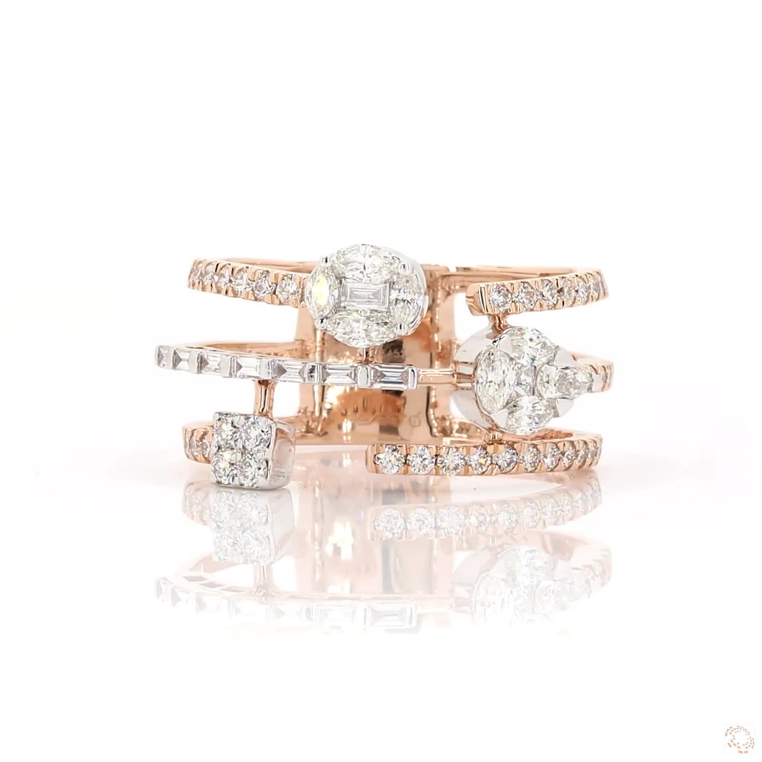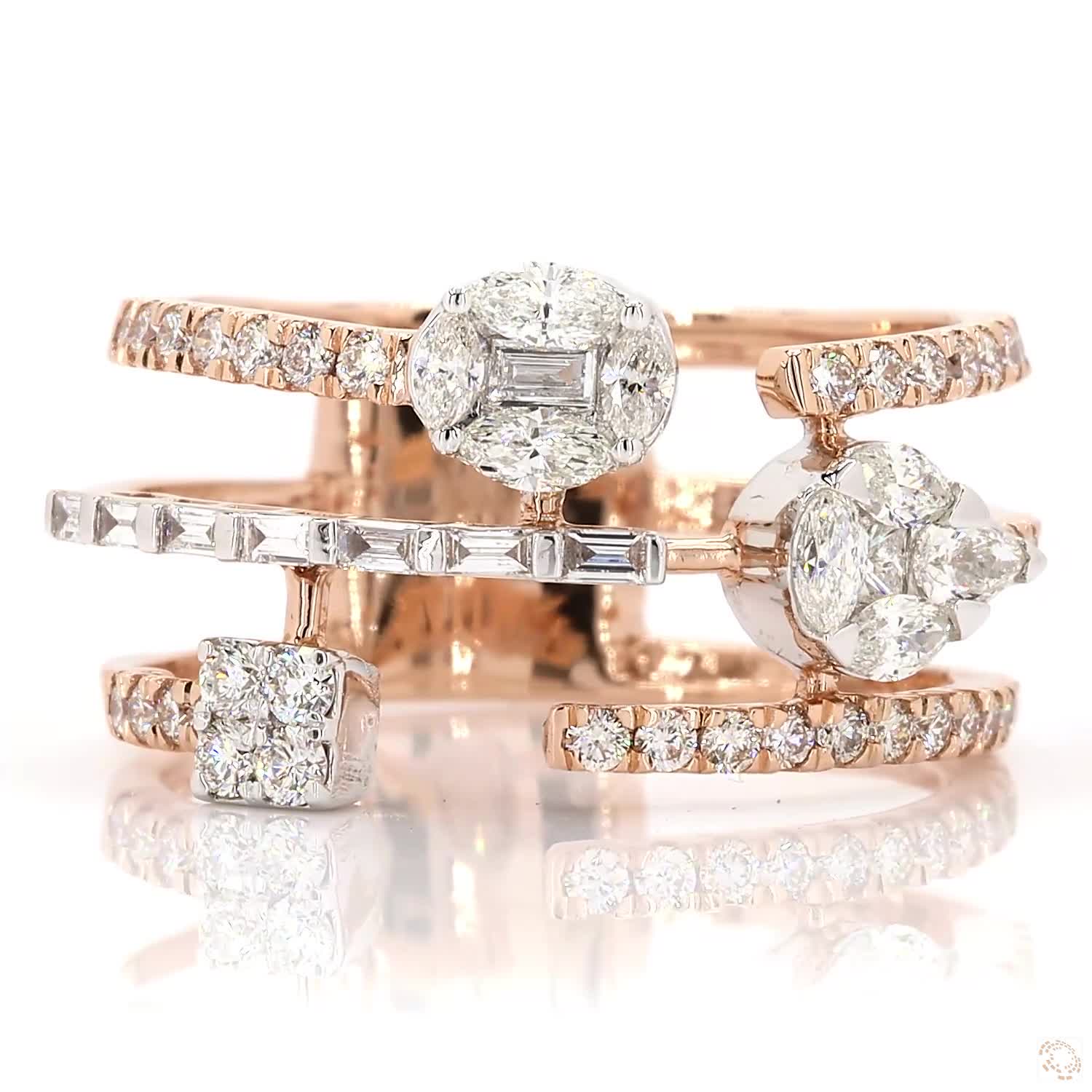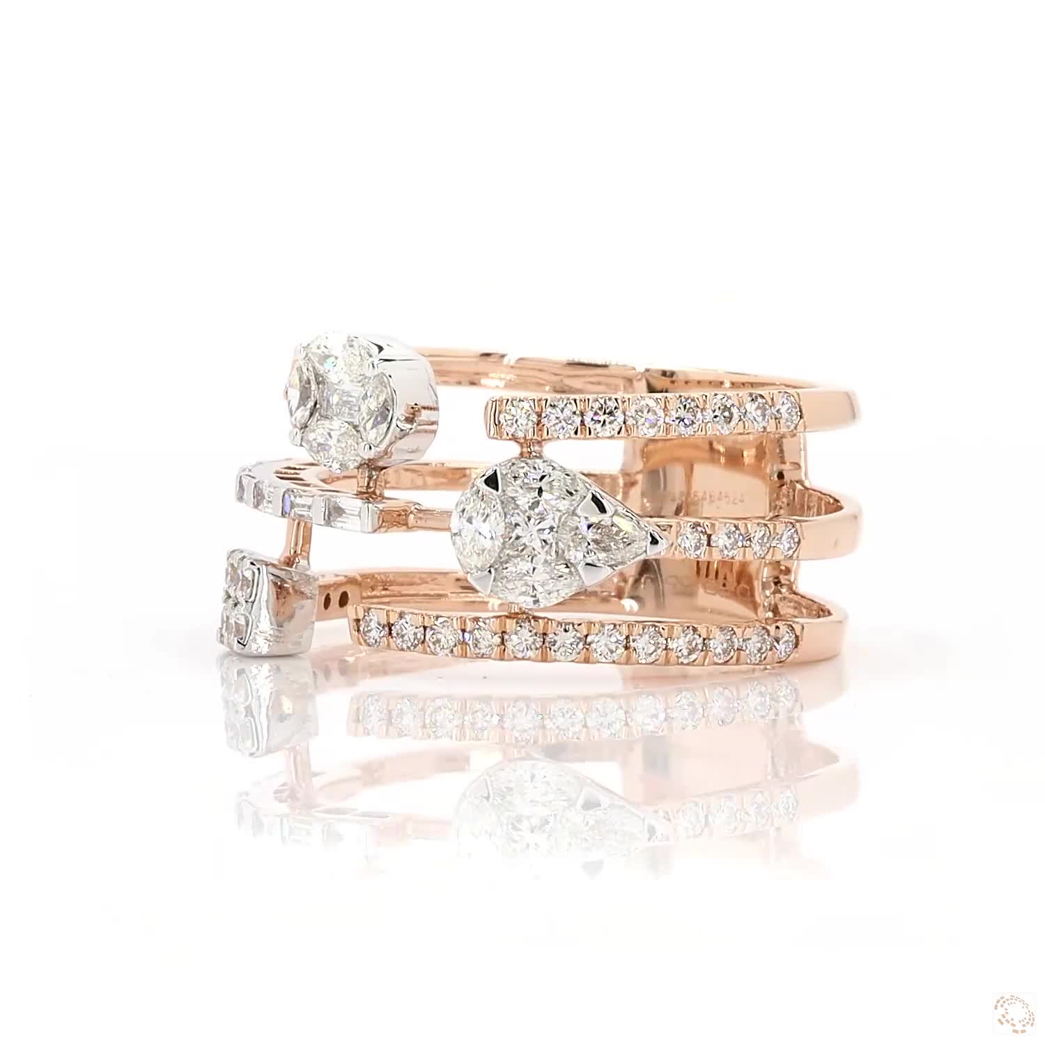 Experience the epitome of luxury with the Diamond Fusion Band Ring, showcasing a harmonious blend of four exquisite diamond shapes: round, baguette, marquise and pear-cut diamonds, accompanied by princess-cut accents. This masterpiece boasts intricate craftsmanship and exceptional fire.